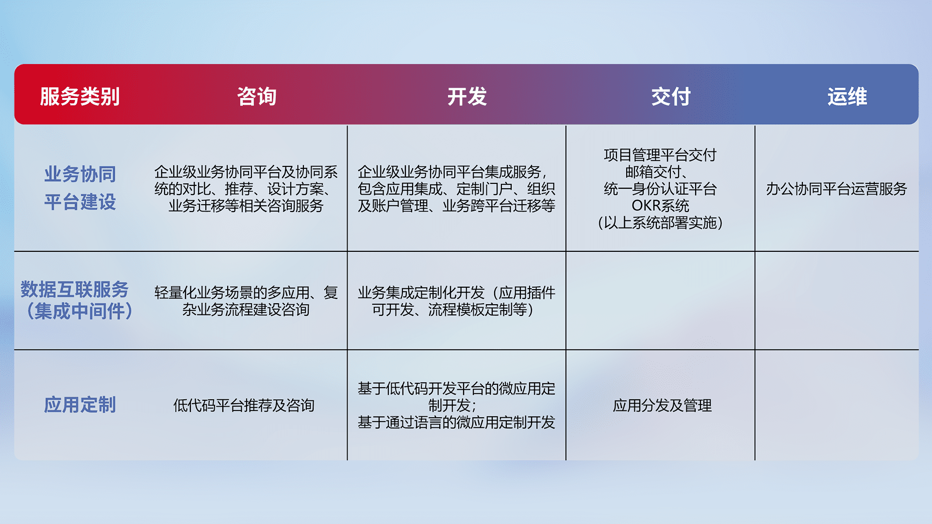 针对钉钉、、企微、、、IDaas等平台级产品提供产品的规划、、、、方案、、交付、、定制化开发等服务,,,实现如统一协同办公、、智能客户服务、、、混合会议管理、、智能数据查询、、、等业务场景,,实现数字化转型。。。