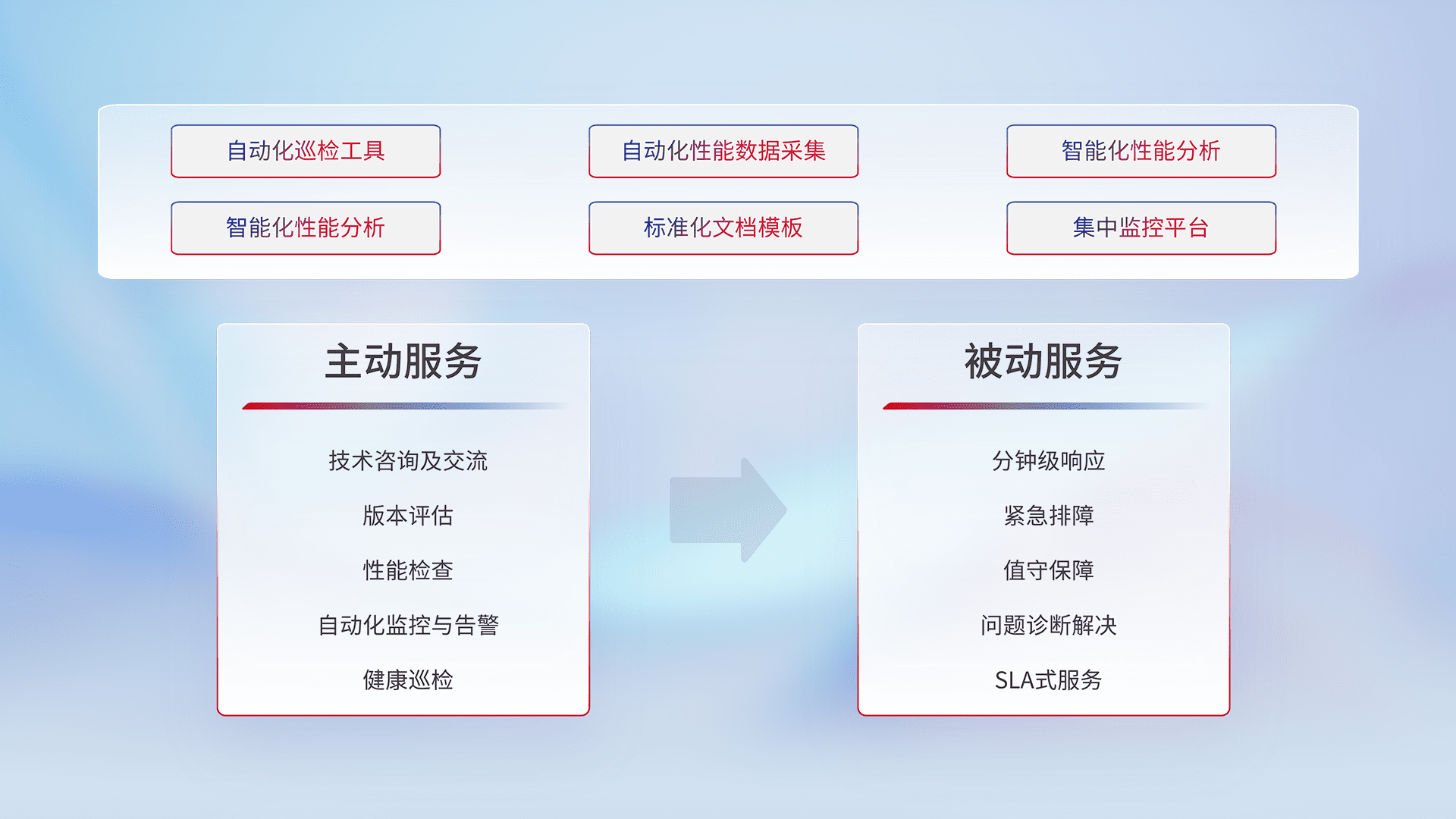 智能化工具和标准化文档,,保障服务质量,,,提供主动服务(包含技术咨询、、、、版本评估、、、、性能检查、、自动化监控与告警、、、健康巡检)和被动服务包含(分钟级响应、、紧急排障、、值守保障、、、、问题诊断解决、、、SLA服务)。。。