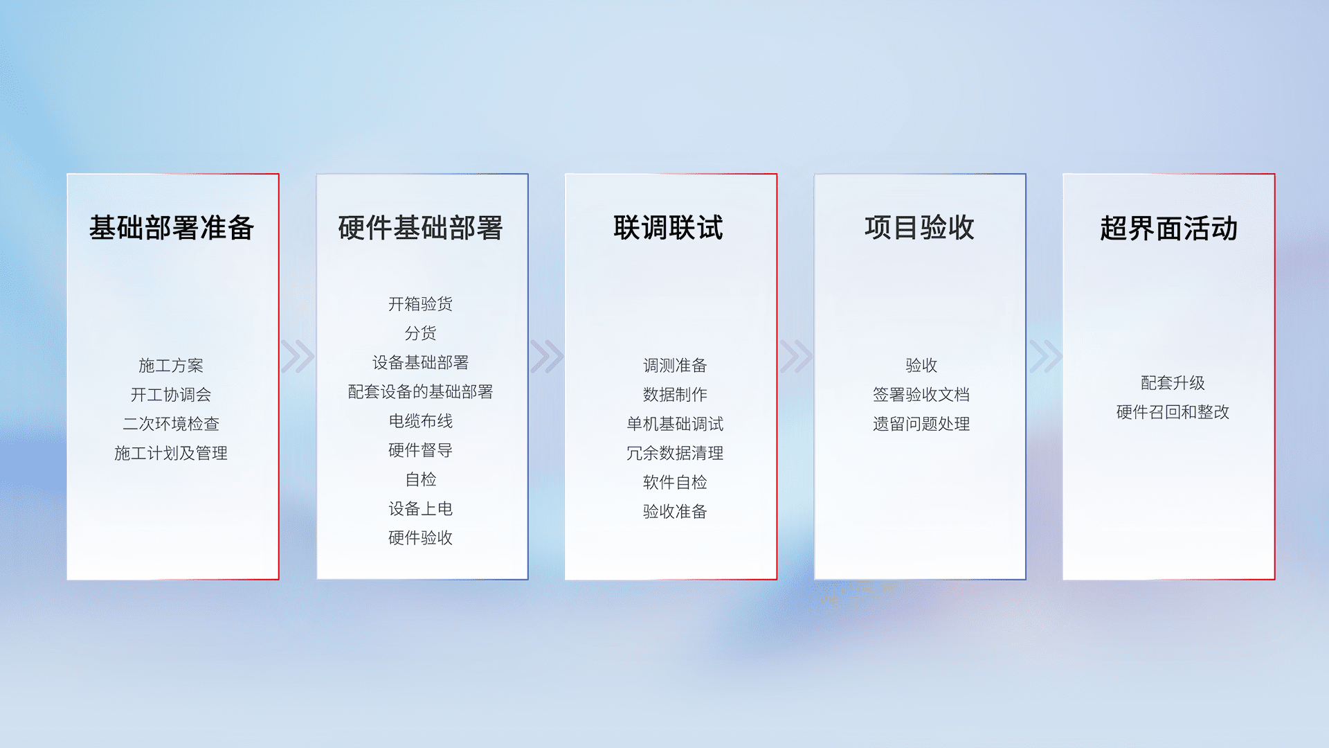 从基础部署准备、、、硬件基础部署、、联调联试、、、、项目验收、、越界面活动的全过程可追溯,,,,保证施工质量和进度。。。